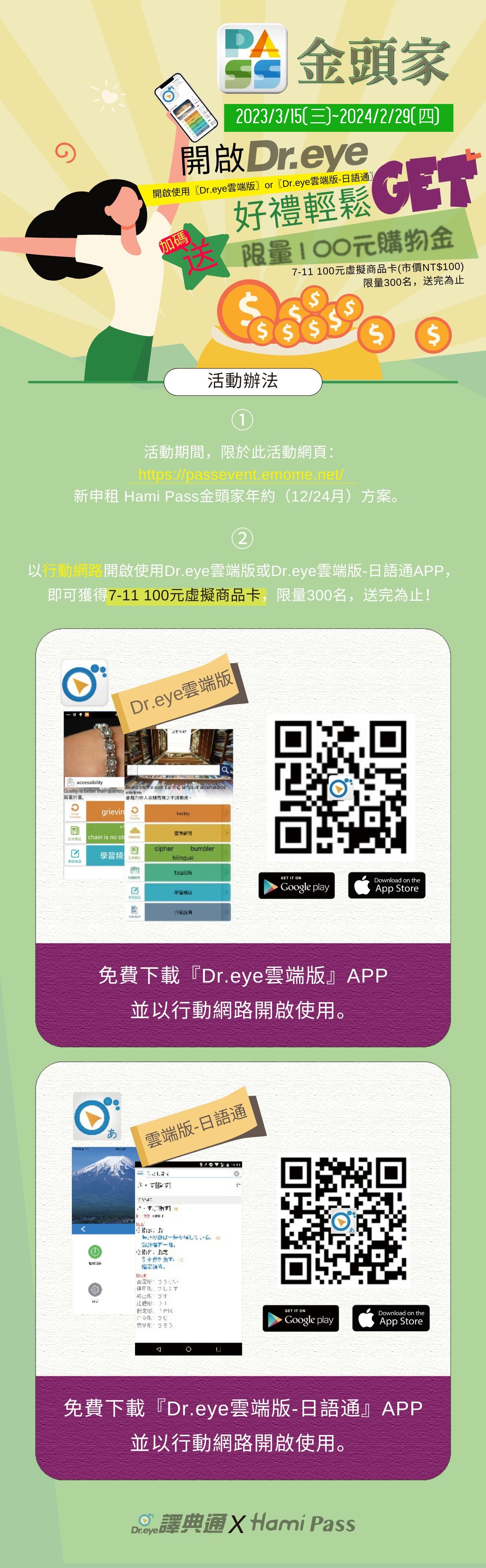 Pass金頭家年約(12/24月)方案。以行動網路開啟使用Dr.eye雲端版或Dr.eye雲端版-日語通APP,即可獲得7-11